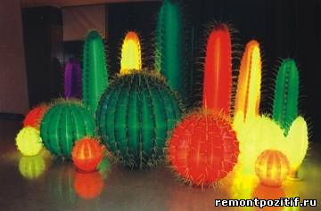 Чтобы украсить участок большими кактусами не обязательно покупать растение, можно приобрести интересную лампу, похожую на него по внешнему виду. Таким образом, получится практичное декорирование зеленой зоны отдыха.