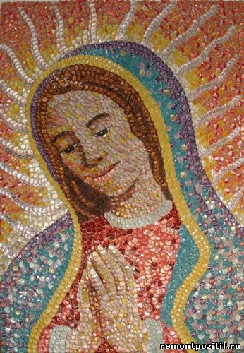 Картины можно писать не только кистями, но и выкладывать их из бутылочных крышек. При этом получаются не менее потрясающие шедевры, достойные внимания и высокой оценки.