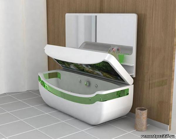 разработала уникальную сантехнику для ванной - Sub-Tub Whirlpool & Washbasin Unit. Концептуальная идея заключается в том, чтобы ванна была не только купелью для принятия водных процедур, но ещё и являлась одновременно раковиной для умывания, с удобными полочками и большим зеркалом. И, что самое необычное, ванна Sub-Tub Whirlpool & Washbasin Unit имеет большой OLED-дисплей.