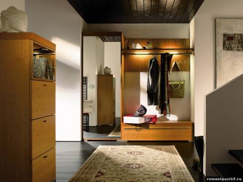Очень удачная планировка для прихожей. Благодаря ей данное помещение кажется очень просторным и вместительным. И это даже не смотря на то, что в предложенном варианте уже имеется очень много самой разнообразной мебели. В целом, понравилось то, как гармонично «перекликаются» между собой потолок и пол, их цвета. Очень красивый получается вид. Большим плюсом является также наличие большого удобного зеркала, которое еще больше расширяет помещение. Особый шарм добавляют такие небольшие дополнительные элементы, как уютные лампочки и скульптура-сувенир на мебели.