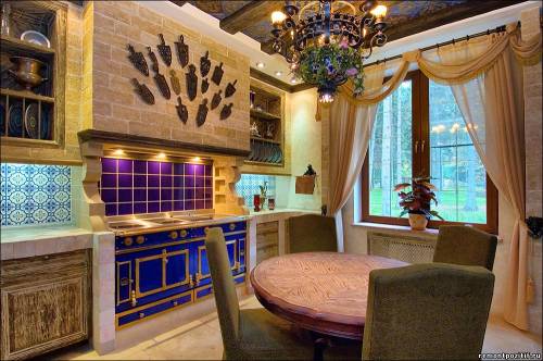 Очень яркая, позитивная, уютная кухня. Поражает сочетание цветов - теплые бежевые тона и холодный синий цвет очень гармонируют между собой. Оформление потолка тоже довольно необычно - темный цвет, балки и классическая люстра.