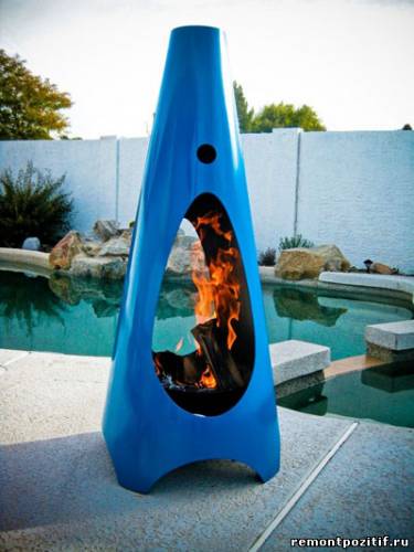 Похожий на космическую ракету. Только не обычную, а из детских фантастических фильмов. Не отказался бы от такого камина на своей даче. Жаль, что, скорее всего, он чисто декоративный. На таком шашлык не пожаришь.