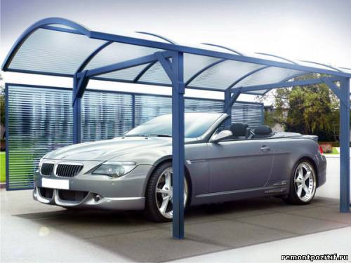 Прекрасный вариант для "летнего" гаража, когда можно не боятся что машина испортится и потеряет блеск от яркого солнца, или дождь испачкает её. Особенно такие варианты подходят для тех, кому лень постоянно загонять машину в гараж, а за счет прочной крыши из поликарбоната можно не беспокоится, что природные явления испортят внешний вид вашего любимого авто.