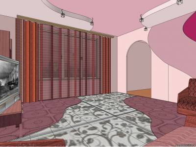 Согласна - замена дверей арками и использование контрастных цветов должны весьма положительно сказаться на пространственном восприятии в столь малом помещении. Мебель более густого оттенка в отличие от стен как бы концентрирует внимание на себе. И, действительно, плавные изгибы и закругленности решетки на стене и рисунка плитки на полу также "уводят" от суженности восприятия и тесноты.