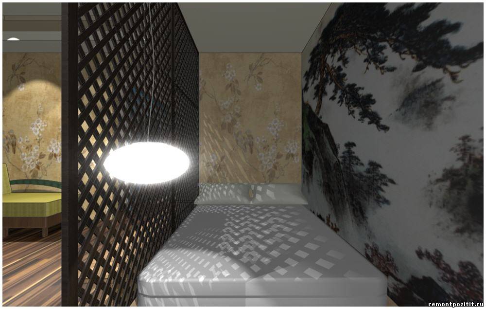 Наш дизайн-проект рассчитан на те квартиры и дома, в которых имеется мало комнат, но при этом хотя бы одна из них отличается большими размерами. Такая комната идеально подойдет для создания гостиной-спальни путем зонирования помещения. С этой целью мы предлагаем использовать перегородку, выполненную в китайском стиле, которая не только поможет разделить комнату на две части, но и будет нести на себе сильную декоративную нагрузку.