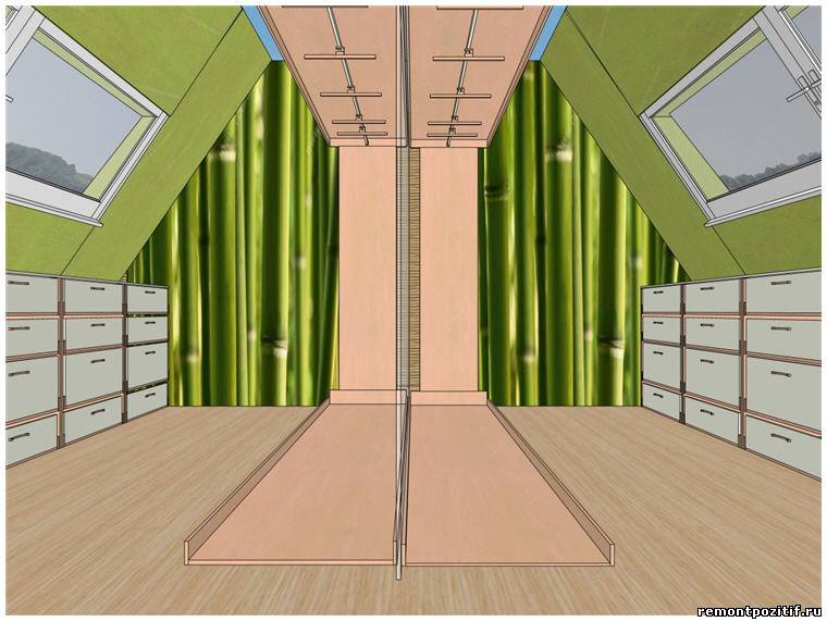 А за дверью, что имеется в спальне на мансарде неподалеку, разместиться гардеробная.