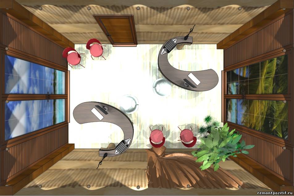 Для создания интерьера офиса туристической фирмы мы решили использовать теплую цветовую палитру и большое количество натурального дерева. Возле офисных столов установлены муляжи окон, за каждым из которых виднеется картинка – панорама какого-нибудь курорта. Для изготовления таких «окон» могут быть использованы как стандартные стеклопакеты, так и обычное тонкое стекло.