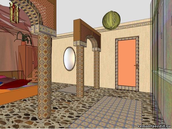 Конечно, не один восточный стиль не обходиться без различных колонн и перегородок с витиеватыми и изящными формами, именно такие элементы мы и задействуем в спальной комнате. С помощью колонн и перегородок в виде арки разделим комнату на две зоны, та часть, где стоит кровать, и будет главным композиционным центром. Так как наш интерьер подразумевает использование лоджии как кабинета, то сделаем все в общем стиле, а арка на колоннах открывает вход на лоджию.