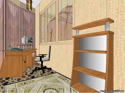 Не обойдем стороной и кабинет, расположенный на лоджии, ведь такой вариант для многих квартир приемлем, тем более, если нет свободной комнаты для него или же просто пространственные проблемы не позволяют соединить спальню и кабинет. В нашем кабинете мы поставим стол с полукруглой формой, удобный стул, шкафчик для документации.