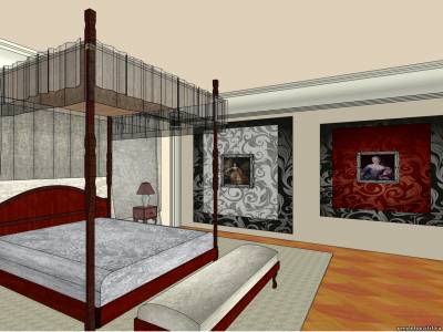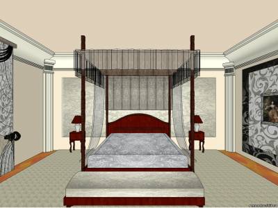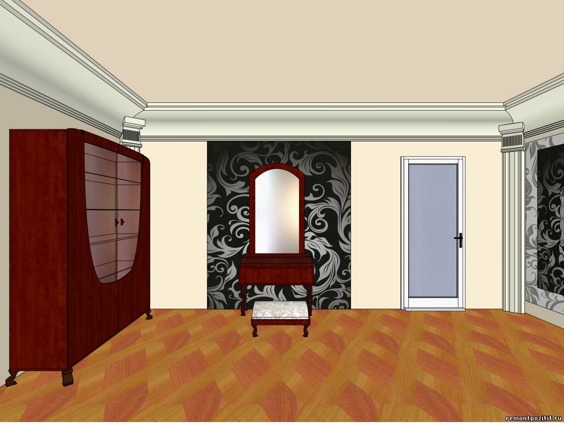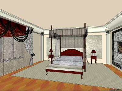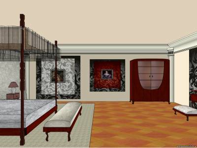 Также в нашей спальной комнате стоит столик с зеркалом и пуфиком, на этом месте, несомненно, будет восседать женщина, поэтому мягкое сиденье и удобное расположение зеркала и полочек оценит каждая дама. Мы будем избегать прямых углов, делая плавные линии и столика с зеркалом, и у пуфика, а темный фон, что будет за «будуаром», прекрасно контрастирует с красным деревом.