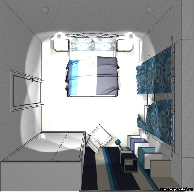 Сегодня в дизайне интерьера очень модно использовать текстиль и настенные покрытия с одинаковым рисунком. Поэтому для оформления кровати мы выбрали покрывало с расцветкой, повторяющей цветовое решение зоны отдыха.