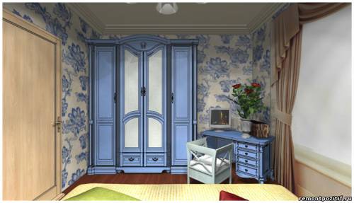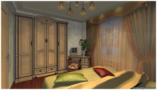 Я не сторонник использования компьютера в спальне, как и громоздких шкафов. Вполне хватит и комода, трюмо просто обязательно. Зеркала придают объем, низкая мебель визуально приподнимает потолок. Шкаф , даже с зеркальными дверцами, давит пространство. Пуфик перед трюмо вместо кресла, стула со спинкой тоже более удачно впишется в атмосферу спальни.